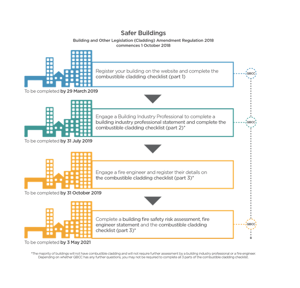 A building owner was required to engage the services of a Fire Engineer by the 31st October 2019, who will then undertake a further assessment and provide recommendations. All building owners (in Part 3) must have completed the building fire safety risk assessment, fire engineer statement and combustible cladding checklist (questions 7-10) no later than 3rd May 2021 so as to comply with the guidelines.